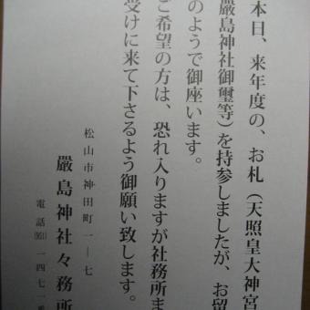 お留守のお家にはこのようなチラシを配布させていただきましたので、ご希望の方は当嚴島神社までお越しください。