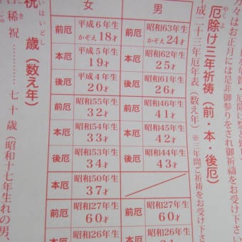 厄年の前年が前厄(まえやく)、次の年が後厄(あとやく)となります。