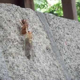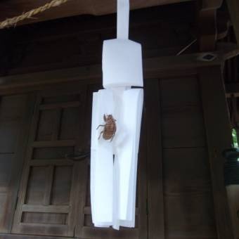 セミの抜け殻もそこらじゅうにありますが、そんな中、紙垂(しで)についている抜け殻を発見!
