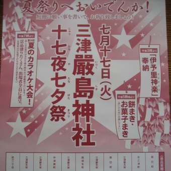 ちなみに十七祭は嚴島神社独特のおまつりで、宮島の厳島神社では旧暦の6月17日に管弦祭(十七夜とも呼ばれる)として行われております。当嚴島神社では七夕とあわせて毎年7月17日にお祭をしておりますので、明日は短冊に願い事を書いて笹につるすこともできます。