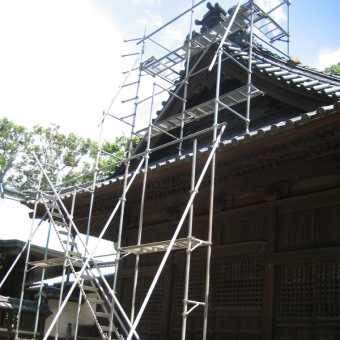 さて、拝殿の屋根の鬼を修繕する為に、拝殿の両端に足場を組んでおります。