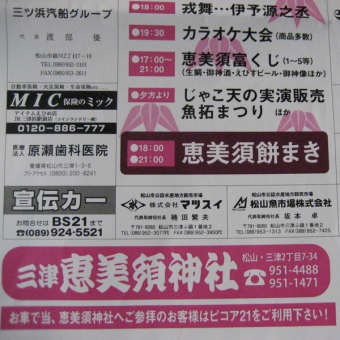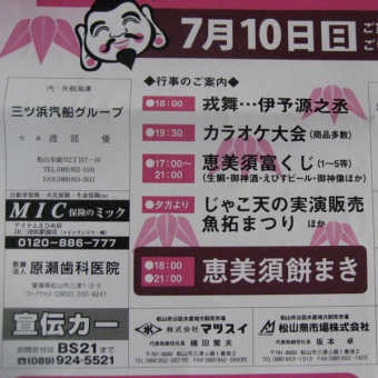 今年も7月10日に恵美須神社(松山市三津2丁目7番24号)にて夏祭りが執り行われます。