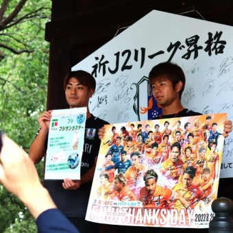 愛媛FCの選手とオーレくん、ハッぴぃが必勝祈願祭を行いました。