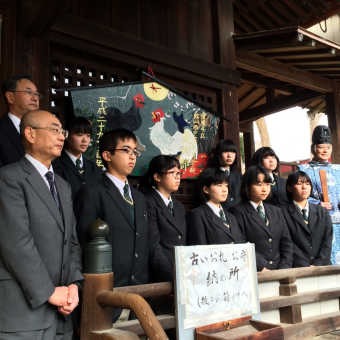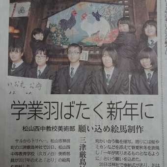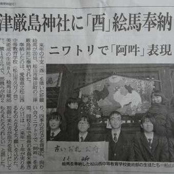松山西中等教育学校美術部の生徒が作製した特大絵馬が当厳島神社に奉納されました。