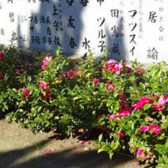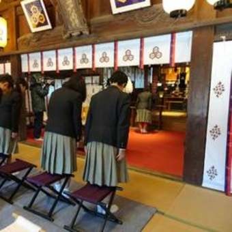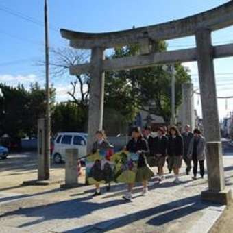 境内のサザンカが見ごろとなったこの時期に当厳島神社の境内に集合した生徒たち