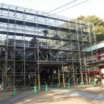 足場には屋根を付けるべく、大型の重機で屋根部分を吊るして設置していました。