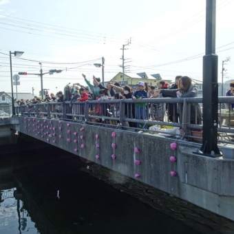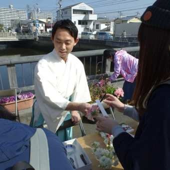 お花にお名前などを書いた紙を結び付け宮前川に流しました。