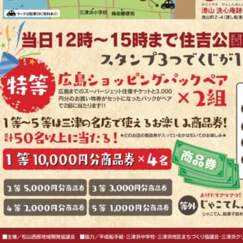 スタンプ3つでひける、空くじなしのくじ引きの特賞は広島ショッピングパックペア!