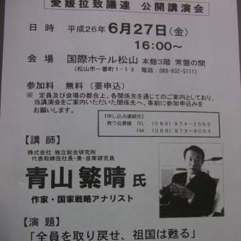 さて、6月27日に愛媛拉致議連 公開講演会が国際ホテル松山にて講師に青山繁晴氏を迎えて16時~行われます。