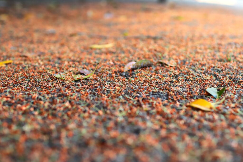 雨のあと、境内には金木犀の花がやわらかく散り、地面が淡い金色に染まりました。 満開の香りに包まれていた日々も、雨とともに静かに季節が移ろっていきます。 -