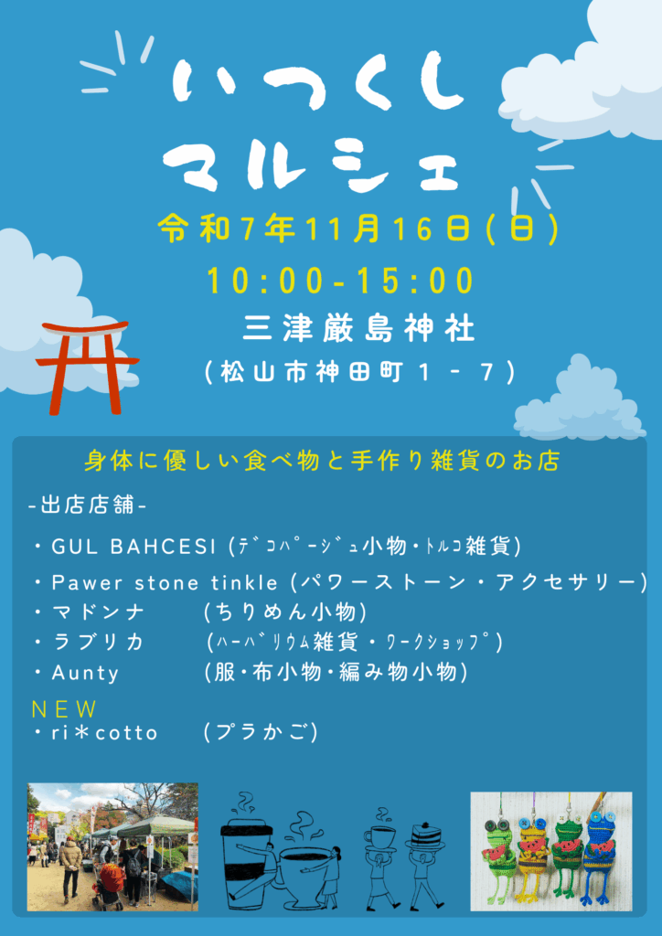 令和7年11月16日(日)10:00〜15:00三津嚴島神社(松山市神田町1-7)にて「いつくしマルシェ」を開催いたします。 体に優しいお食事や、手作りの雑貨・アクセサリーなど、地域の皆さまが心を込めて作られた品々が並びます。 新たに「ri*cotto」さんの出店... -
