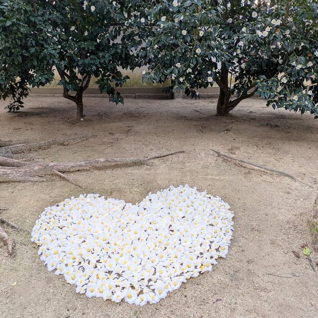 侘助(わびすけ)が咲き始めました。 落ちた花で描いたのは、厄除けと繁栄の象徴「猪の目(いのめ)」です。(ハート型ではありません(笑)) ご参拝の折に是非、足元の小さな祈りをご覧下さい。 -