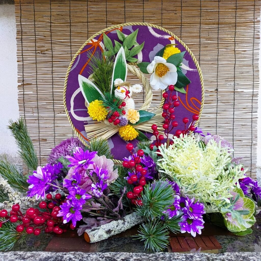 フラワーショップ小谷様より正月に向けての花手水を奉納頂きました。 あでやかな紫色を背景に、縁起の良い松の緑、吉兆のしるしである南天の朱、気品ある葉牡丹に艷やかな菊、白椿の花が重なる華やかな花手水。 中央には午年に因んで、可愛らしい仔馬が覗... -