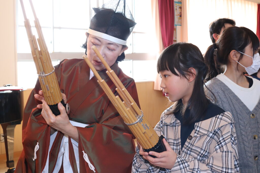三津浜小学校にて、6年生の皆さんへ雅楽授業を行いました。 午後の授業でしたが、子どもたちは最初からとても元気で、雅楽の音が鳴り響くと一気に空気が変わりました。 特に楽器体験の時間では、笙の和音に「わあ…!」と声が上がり、篳篥の力強い音には驚... -