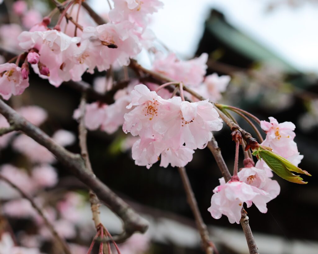 しとしとと降る雨に、枝垂桜がやさしく揺れています。花びらに宿るしずくが、より一層その美しさを引き立ててくれます。 雨の日ならではの、静かな春のひととき。 -