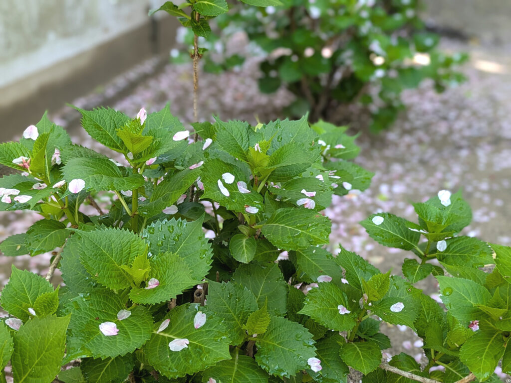 昨日とはうって変わって爽やかな晴れ空が広がる松山。 雨上がり、あじさいの葉にそっと残る桜の花びらを見つけました。散りゆく春と、これからの季節が交わるひとときを感じます。 -