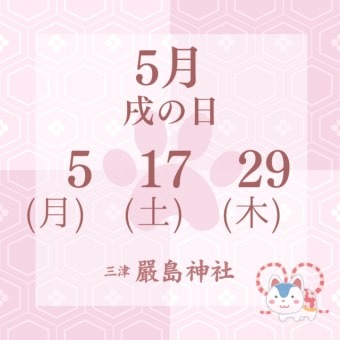 令和7年(2025年)5月の戌の日をご案内致します。▶ 5月5日(月)、29日(木)▶ 5月17日(土)▶ 5月29日(木)安産祈願は、妊娠5か月目の戌の日に、母子の健康と安産を祈るご祈祷です。戌(犬)は多産でありながらお産が軽いことから、古くより戌の日に安産... -