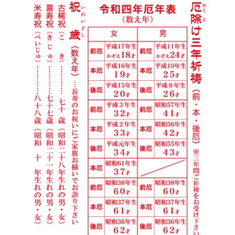 早いもので大晦日を迎えました。今年も皆様方に支えていただき、大変お世話になりました。誠にありがとうございました。大変遅くなりましたが、来年の厄年についてご案内いたします。本厄に該当する方は男性が25、42、61歳女性が19、33、37、... -