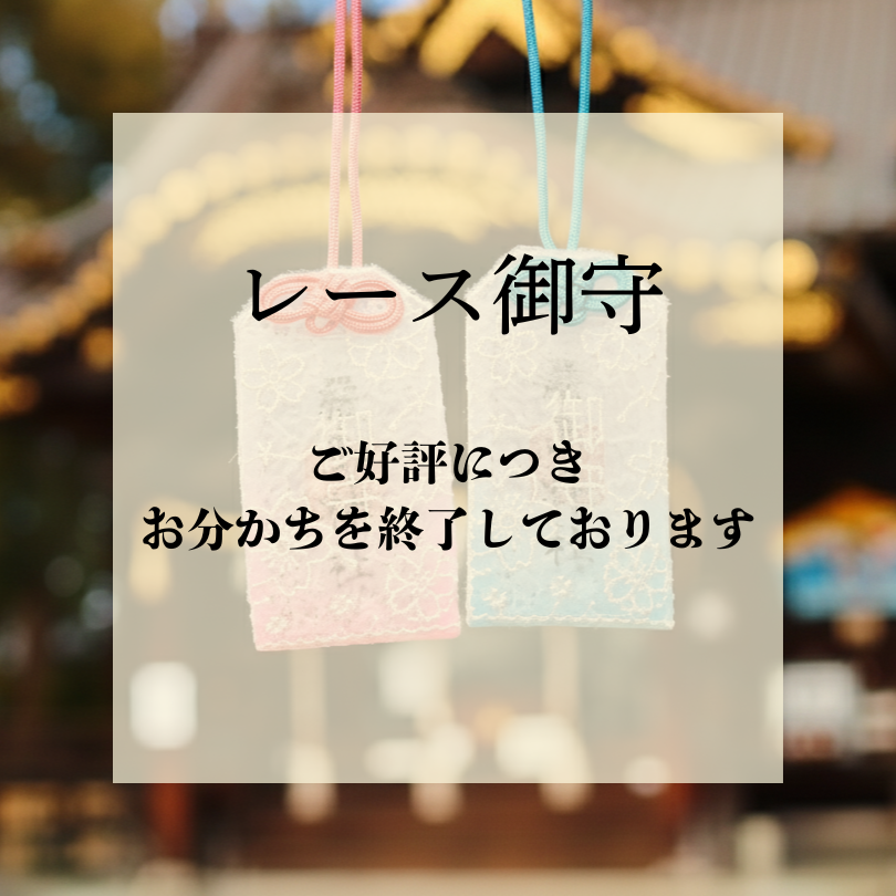 レース御守は、ご好評につき、すべての方へのお頒かちを終えました。たくさんのご縁をお結びいただき、誠にありがとうございました。 予想を上回る反響をいただき、奉製が間に合わず心苦しく存じます。皆さまの一年が健やかで、実り多きものとなりますよう... -